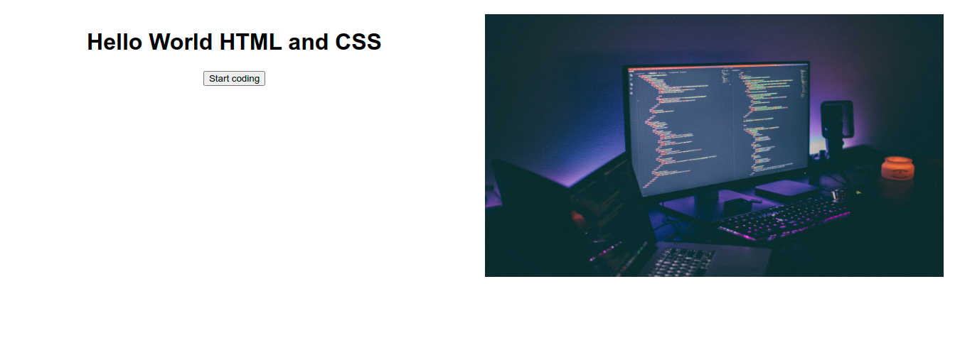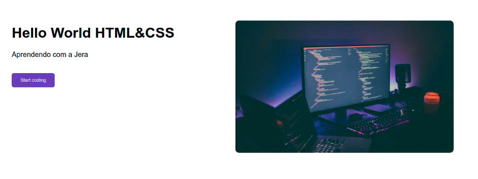 Como você deve ter reparado, no nosso HTML temos uma div com a classe container e dentro dela temos outras duas divs com as classes section-text e section-image. No nosso CSS instanciamos a classe .container e adicionamos propriedades de largura , altura e display (que é a forma como nossos itens podem ser exibidos, você pode ler mais sobre a propriedade display flex que utilizamos aqui). Para as outras classes que criamos, como section-text e section-image, como ambas estão dentro da div container, no CSS elas precisam ser chamadas da seguinte forma: .container .section-text, criando uma espécie de hierarquia nas classes. Os demais elementos que adicionamos nas nossas classes, são bem similares, estilizamos altura, largura, alinhamento do texto, cor do texto e fonte. Ao abrir o index.html agora nossa página deve estar assim: