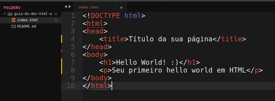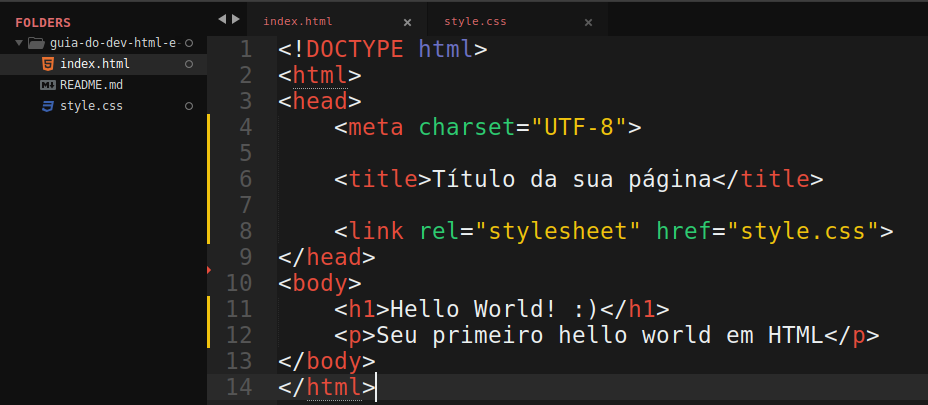 Neste ponto falaremos sobre a sintaxe básica de qualquer página com HTML e CSS. Então já abre seu editor e se prepara para colocar a mão na massa, digo, no código. Você pode aproveitar esse Guia para criar um repositório no Git e já colocar em prática os conceitos aprendidos no nosso Guia do Dev que fala sobre Git e Github, se você não viu ainda é só clicar aqui, mas não esquece de voltar aqui, viu?!