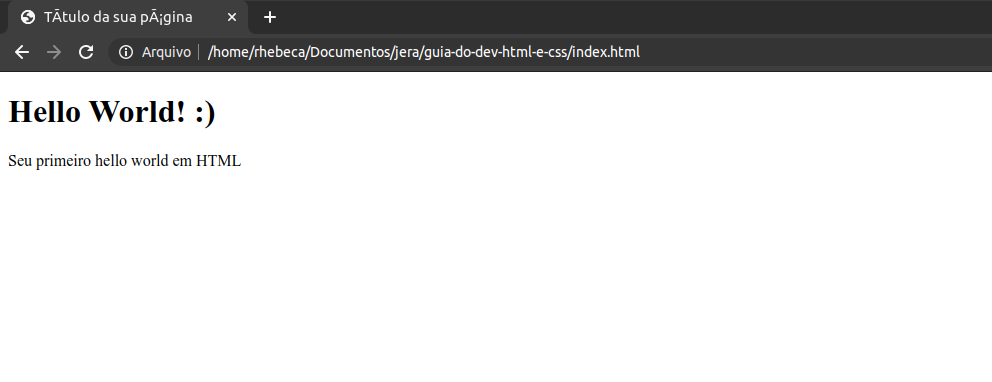 Você deverá conseguir visualizar as informações que inseriu no body e no head (corpo da página e o título no título da aba). Porém como podemos ver, a acentuação ficou estranha, para arrumar isso precisaremos inserir uma configuração no head da nossa página que irá dizer que ela deve interpretar utf-8.