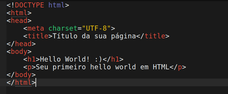 Você pode visualizar no código acima as tags que comentamos, por exemplo, <body> é uma tag, sempre que uma tag é aberta, é necessário que ela seja fechada posteriormente </body> e tudo que fica dentro deste intervalo onde abrimos a tag e depois fechamos, irá com as propriedades dela. Falando em body, ela é uma das principais tags de qualquer página HTML e como a própria tradução diz, é o corpo da página. Então tudo que estiver dentro dele aparecerá visualmente na página.