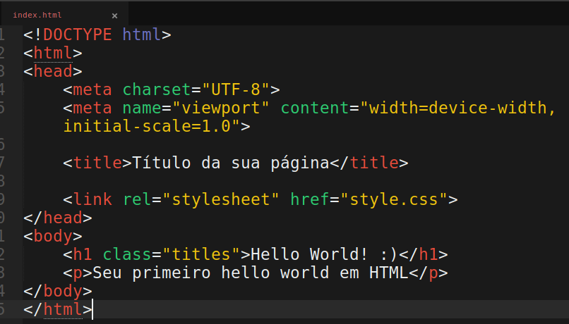 Agora, abra seu editor de texto, crie um arquivo chamado index.html e salve em um lugar de preferência, em seguida abra o arquivo e coloque o código acima nele. Seu código ficará assim: