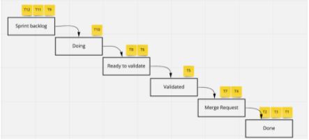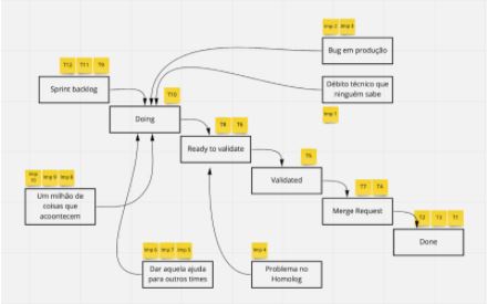 E por que eu gostei tanto dessa pergunta? Porque o Kanban é focado em fluxo de trabalho baseado em filas. Dessa forma, naturalmente a nossa fila deveria ser única com todas as demandas vindo do ponto inicial, o Product Backlog, e entrando na pipeline do time. Aqui na Jera, nossa pipeline é Sprint Backlog, Doing, Ready to Validate, Validated, Merge Request e Done. Então, nossa fila deveria ficar mais ou menos assim: