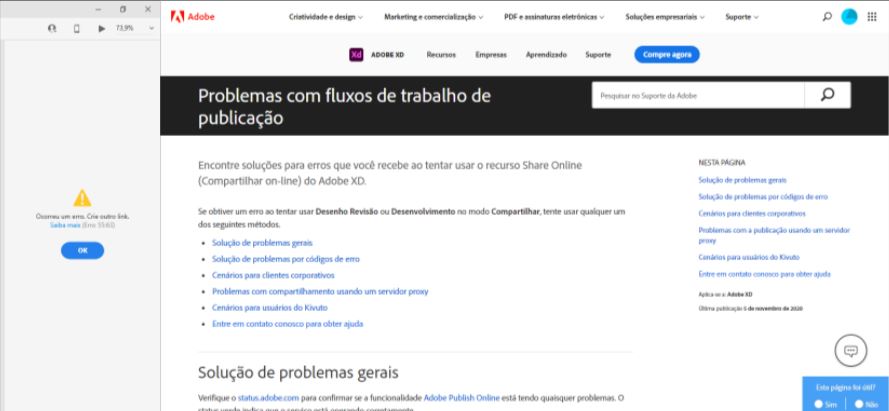 No exemplo da Adobe Xd, houve um erro e apareceu a opção de saiba mais. Em seguida, o usuário tem acesso a uma página com possíveis soluções do problema e caso não encontre, é possível entrar em contato com alguém para ajudar a resolver.