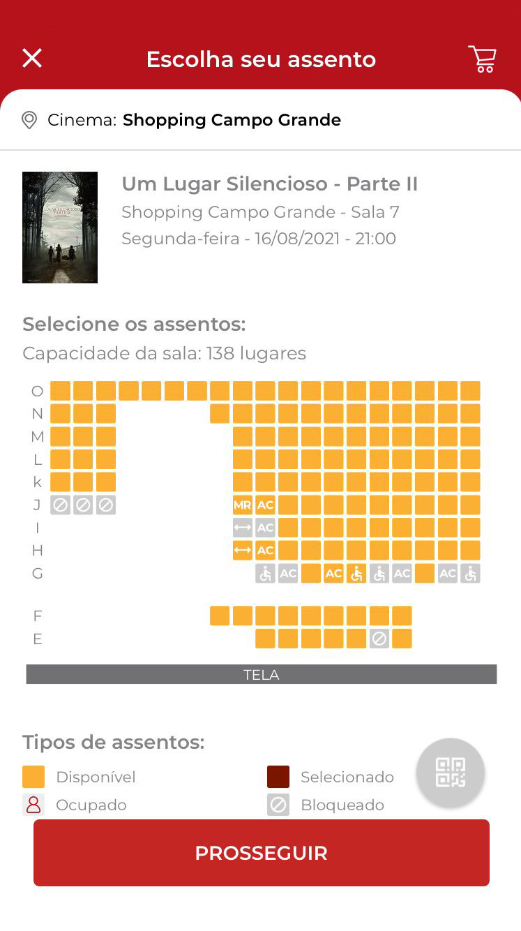 No aplicativo do Cinemark, existe uma tela para escolher os assentos. O usuário consegue ver uma representação do cinema e assim ele consegue escolher o lugar em que vai sentar.
