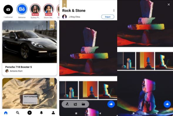 No aplicativo do Behance, quando o usuário abre um projeto e rola a página, a plataforma entende que o usuário que ver o projeto e não os outros ícones que ficam na tela, por isso depois de um tempo de scroll, as partes que não são necessárias somem e o usuário consegue visualizar somente o projeto.