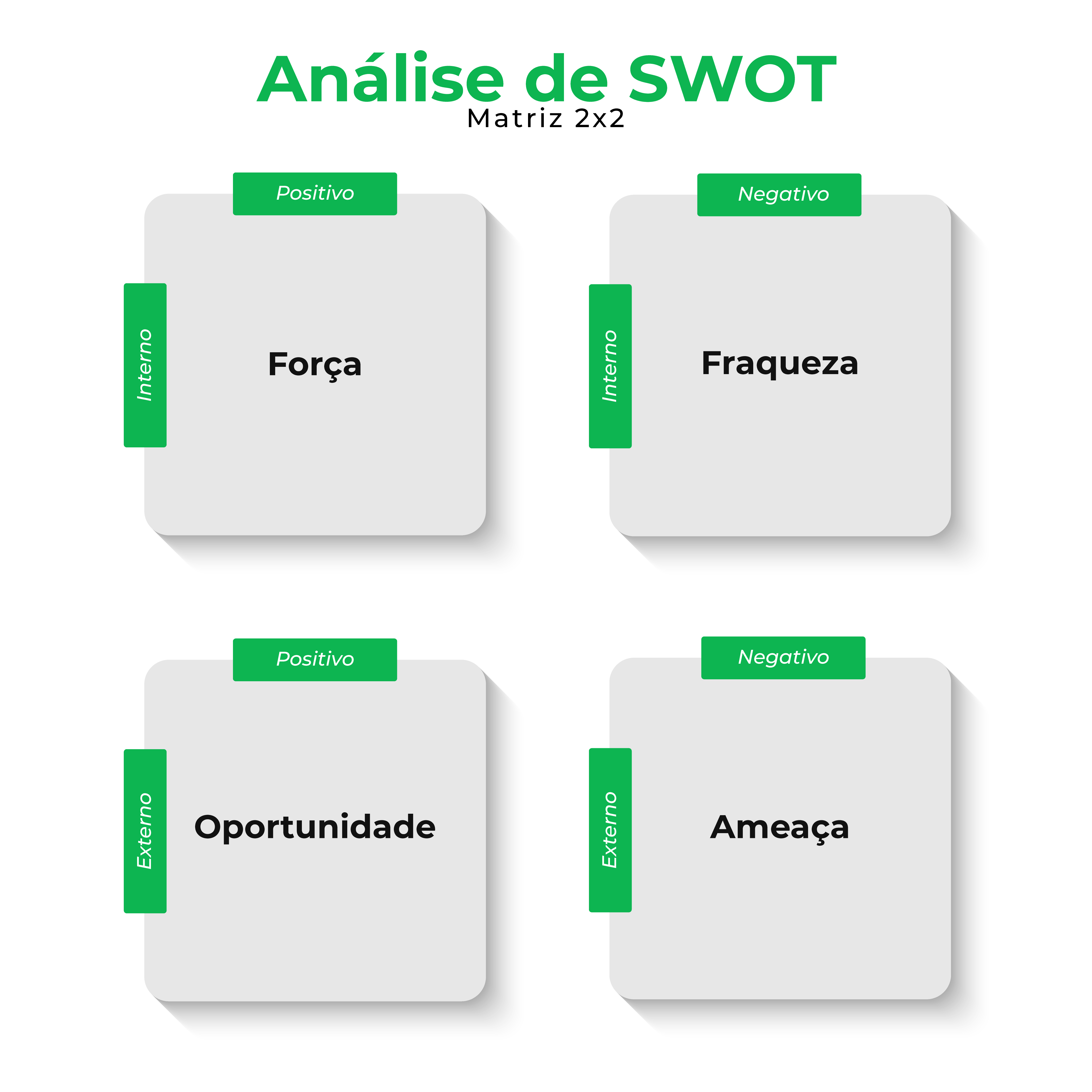 A análise de SWOT é um instrumento para desenvolver uma matriz 2×2, onde separamos influências externas/internas e positivas/negativas que existem no cenário onde uma organização está inserida.