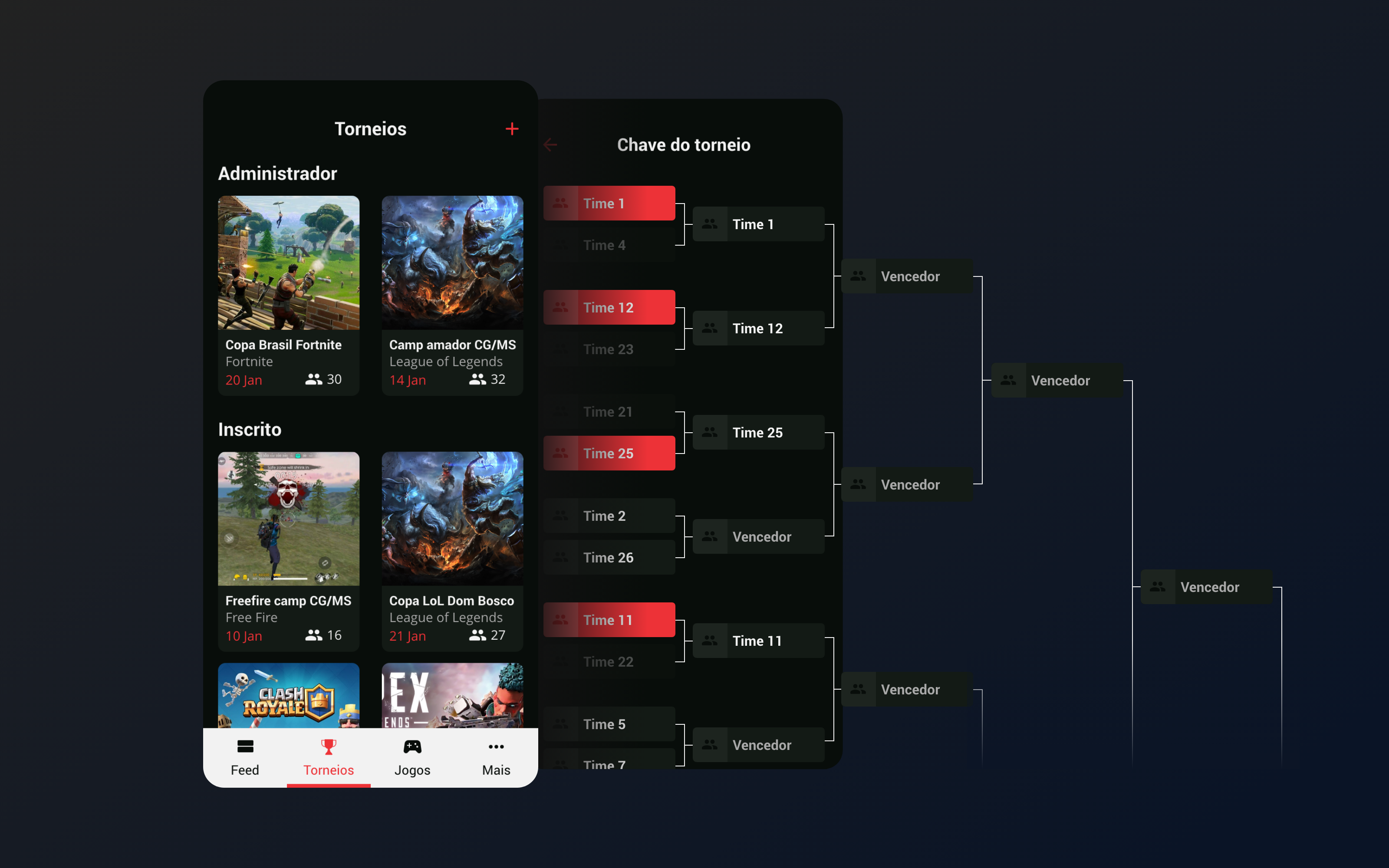 Os torneios são criados rapidamente e podem ser privados ou públicos. As tabelas, chaves e rankings são automáticos, o que torna a experiência simples e fácil de administrar.