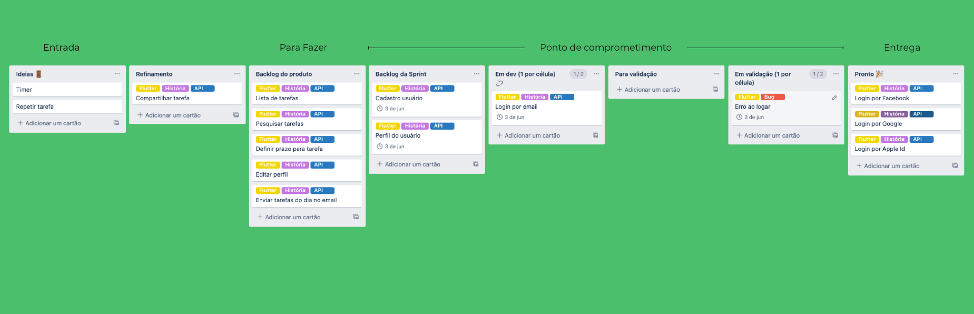 A ferramenta que utilizamos para fazer a gestão do quadro é o Trello, até mesmo quando estávamos trabalhando presencialmente. Nele identificamos as fases do fluxo: onde a demanda entra (Entrada), a priorização (Para fazer), o ponto de comprometimento (Fazendo ou Em progresso), onde é a entrega (Feito) e quem é o responsável por ela. Abaixo segue um exemplo de um quadro do nosso time.