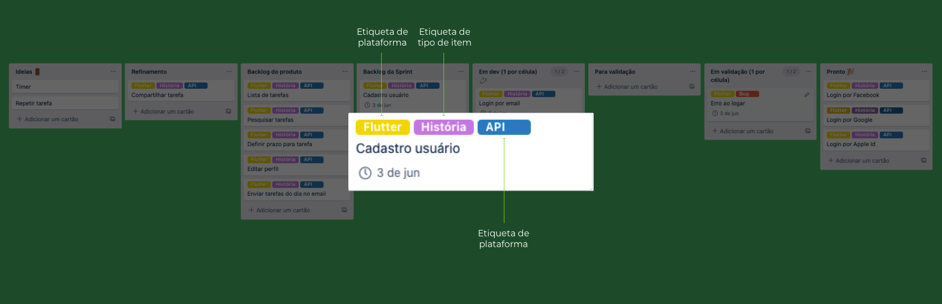 Outro ponto importante é deixar visível os tipos de itens de trabalho (demanda) e a tecnologia a ser desenvolvida. No Trello, utilizamos o recurso de etiquetas para evidenciar, como pode ser visto na imagem abaixo.