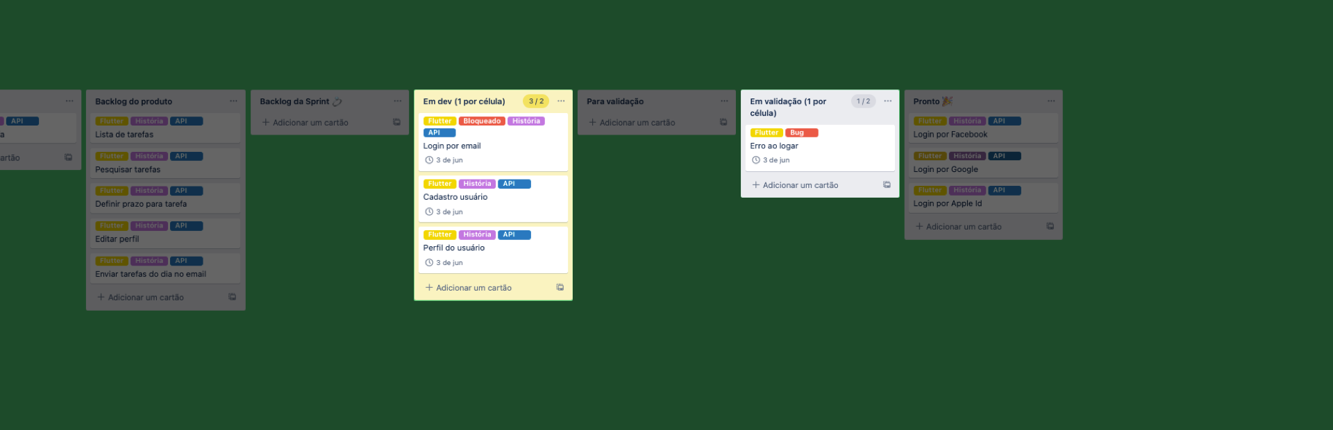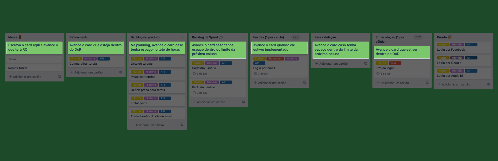 E na limitação por fase, colocamos um limite por célula na etapa “Em dev” e “Em validação”. Cada célula tem entre um a três desenvolvedores.
