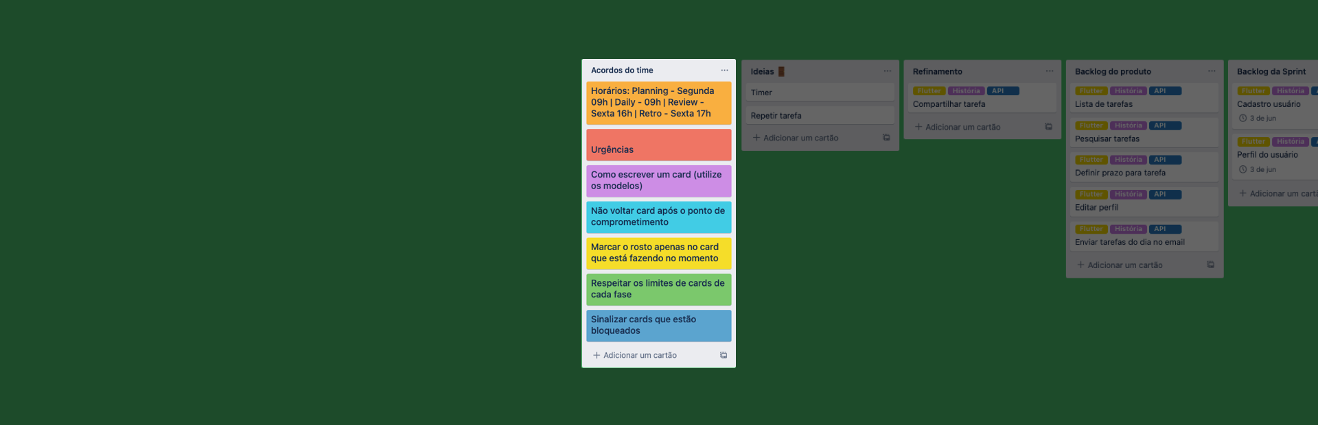 Cada política acordada é documentada no nosso quadro ou em algum local que todos acessem com frequência. No Trello, temos uma coluna para os acordos do time, como no exemplo abaixo.