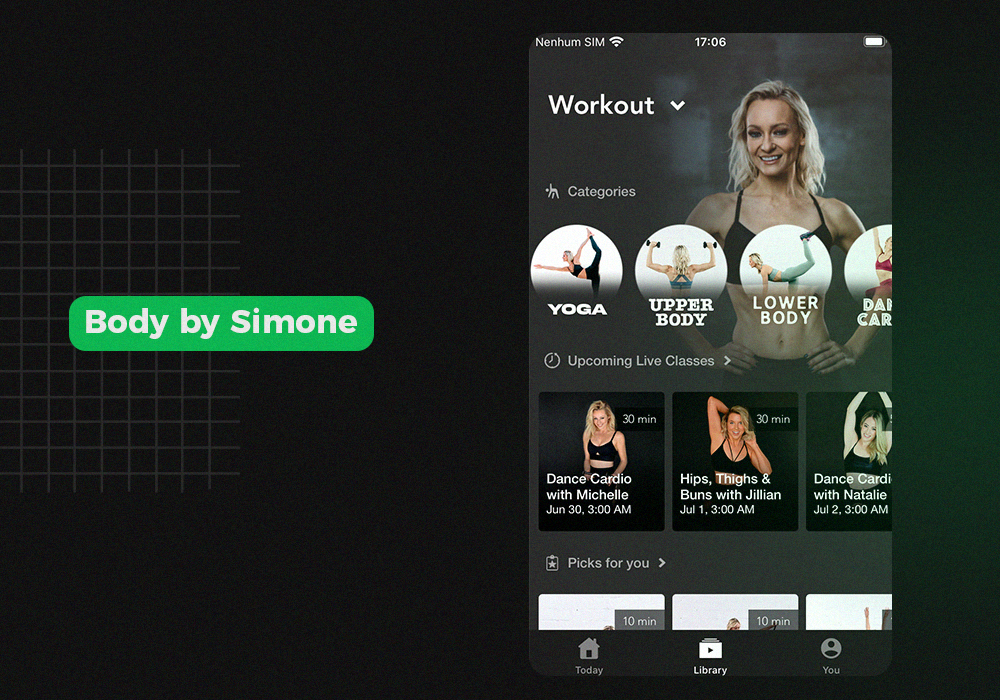 Representando esse arquétipo temos o Body by Simone, um app que te permite treinar com a personal trainer mais requisitada pelas celebridades de Hollywood, Simone De La Rue.