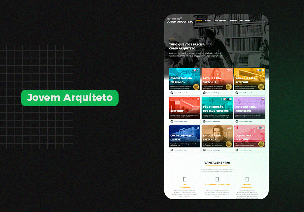 Para representar esse arquétipo, escolhemos o Projeto Jovem Arquiteto, uma plataforma online de cursos que tem o objetivo de ajudar jovens arquitetos e acadêmicos de arquitetura. A ideia é colocar os alunos em contato com projetos reais que irão encontrar no dia-a-dia profissional e ajudá-los a darem o pontapé inicial em suas carreiras.