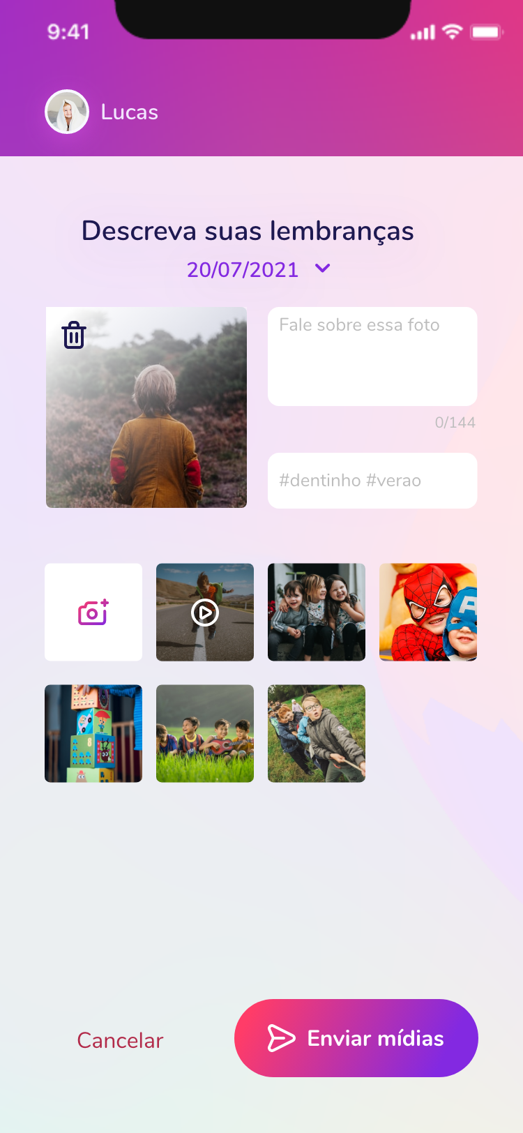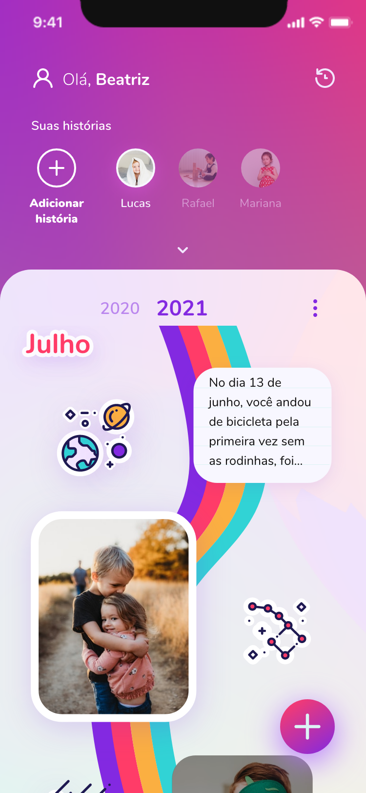 As principais funcionalidades do app são criar timelines, ou seja, histórias paralelas. Caso o usuário possua mais de um filho, é possível criar uma história para cada filho, onde é inserido as mídias e organizadas por ordem cronológica.